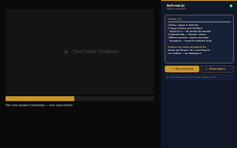 ReProof.AI — Live Debate Assistant adalah alat bantu yang dirancang untuk meningkatkan pengalaman menonton debat apologetika teologis secara real-time. Dengan menggunakan teknologi canggih dari Enoch, program ini memberikan tanggapan langsung terhadap argumen yang disampaikan selama debat di YouTube. Fitur-fitur utama mencakup deteksi kesalahan logika, overlay teleprompter, serta akses ke lebih darisumber untuk memperkuat argumen pengguna.